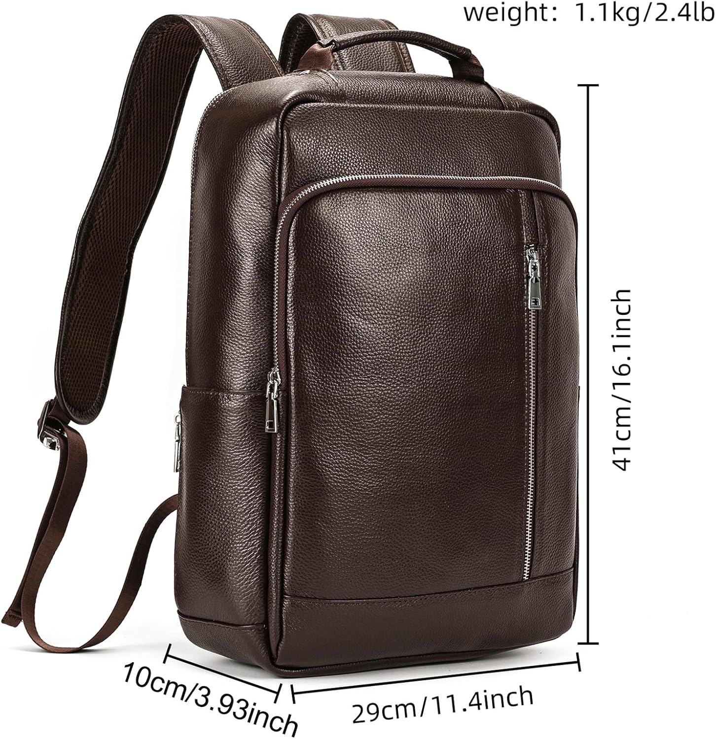 - Large Capacity: Size 16.1″(H) x 11.4″ (L) x 5.9″ (W). Weight: 1.1kg/2.4lb. Inner structure:1 big open pocket, 1 laptop pocket, 1 zipper pocket; Outer structure: 1 big zipper pocket (with 2 card slots,3 open poacket, 2 pen holder), 1 vertical zip pocket, 2 small side pocket. This Casual leather backpack is big enough to carry on 14 inch laptop and many essentials like ipad, A4 files, notesbooks, umbrella, clothes, wallet, water bottle etc.